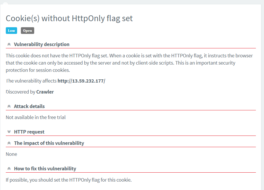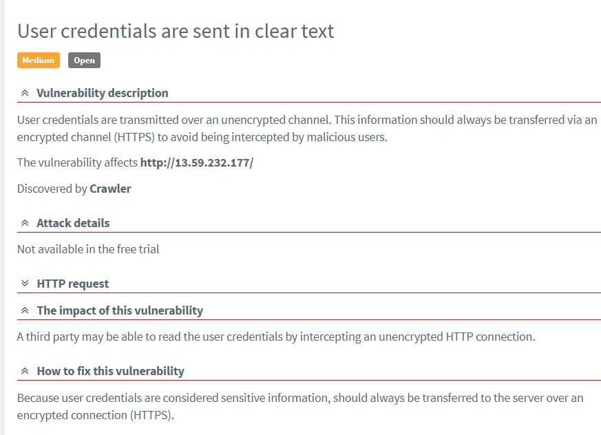 user credential이 암호화되지 않은 채널(HTTP)을 통해 전송되고 있다. 이 정보는 HTTPS를 통해 전달해야 함. 로그인 세션 쿠키에 Secure; HttpOnly; SameSite 속성 정의를 하면 해결됨.