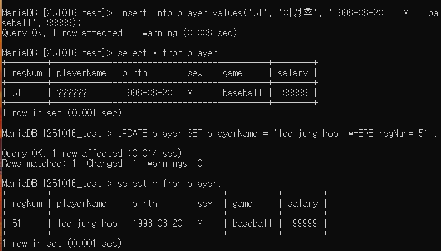player 테이블을 만들고 값을 넣어 보았다. 또 본능적으로 한글로 입력해서 UPDATE를 사용해 영어로 수정했다.