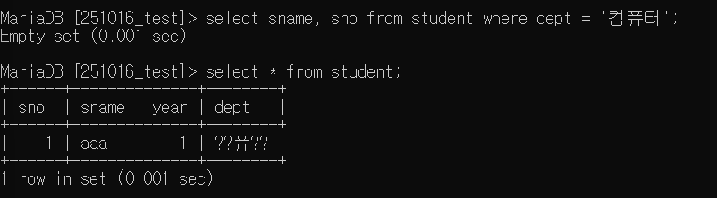 dept = ‘컴퓨터’인 튜플을 조회하려고 했는데 한글이 깨져 진행되지 않는다.