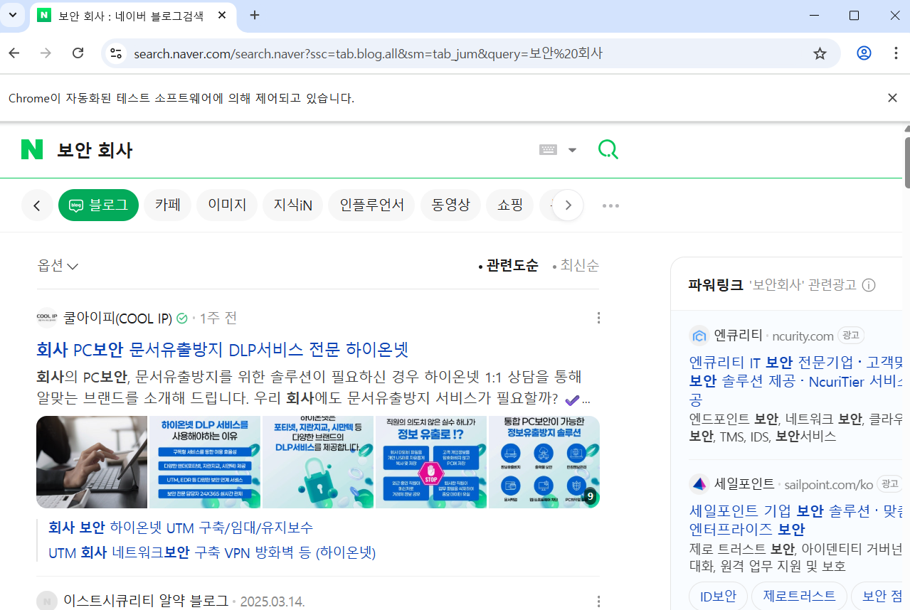 네이버 메인 페이지 접속 -> 검색창에 “보안 회사” 입력 후 엔터, 3초 대기 (검색 결과 로딩)