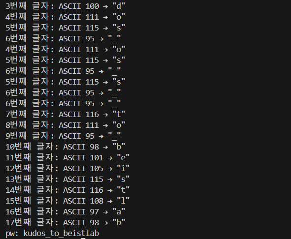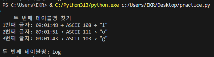 print(f'{i}๋ฒ์งธ ๊ธ์: {time_match.group(0)} โ ASCII {ascii_val} โ "{char}"')