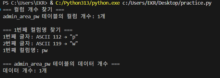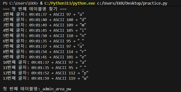 ๋ ๊ฒฐ๊ณผ๊ฐ ๋ค๋ฅธ ๊ฒ์ผ๋ก ๋ณด์ Blind SQL Injection์ ์๋ํ ์ ์๋ค. ์ผ๋จ ํ ์ด๋ธ์ ๊ฐ์๋ถํฐ ์ฐพ์๋ณด์. (์ฌ์ค ์ฝ๋ ์์ฑ ๋ถ๋ถ๋ถํฐ๋ ai์ ๋์์ ์ด์ง ๋ฐ์๋ฐโฆ^^)
