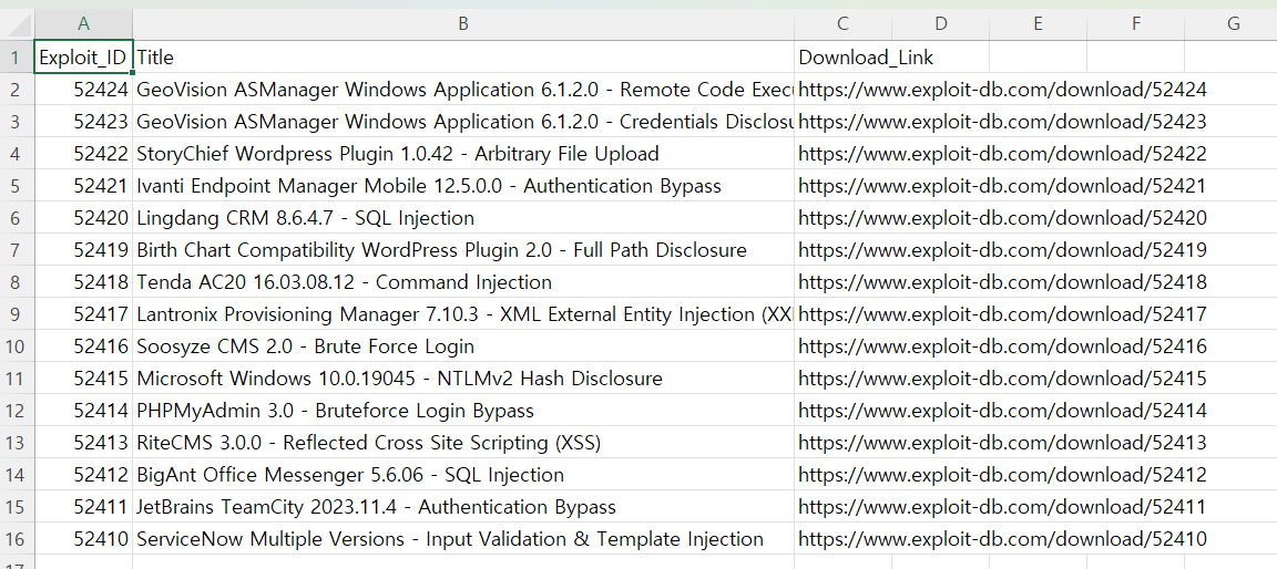 vulnerabilities.append([exploit_id, title, download_url]) # 3개 컬럼