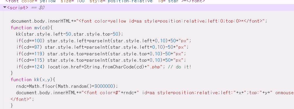 ์๋ฐ์คํฌ๋ฆฝํธ cd ํค์๋๋ก ์์นํด ๋ณด๋๊น 100, 97, 118, 115๋ wasd๋ฅผ ์๋ฏธํ๋ ํค๋ณด๋ ์ฝ๋๋ผ๋ ๊ฒ์ ์ ์ ์์๋ค. (https://blog.outsider.ne.kr/322) 124๊ฐ ๋ญ์ง ์ฐพ๋๋ฐ ๊ฝค ๊ฑธ๋ฆฌ๊ธด ํ์ง๋ง โ|โ ์ธ ๊ฒ์ ์ ์ ์์๋ค. ์ด๊ฑธ ๋๋ฌ์ฃผ๋ฉด ๊ทธ๋ฅ ํ๋ฆผ. ์ฌ์ด ๋ฌธ์ .