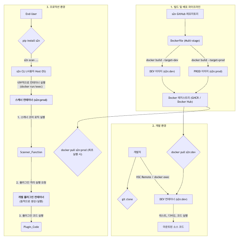 사용자가 s2n scan -u example.com -p custom_scan 명령 실행하면 s2n은 custom_scan이라는 플러그인을 찾을 것이다. 하지만 스캐너 엔진은 도커 컨테이너 내부에 존재할 것이고, 컨테이너는 호스트 PC의 파일 시스템을 기본적으로 볼 수 없다. 그래서 CLI Wrapper가 docker run -v를 사용해 사용자 로컬 디렉토리와 컨테이너 내부의 경로를 연결해 주어야 한다. 이 연결 경로를 통해 Scanner 엔진은 해당 .py 파일을 읽고 동적으로 로드해 실행할 것이다.